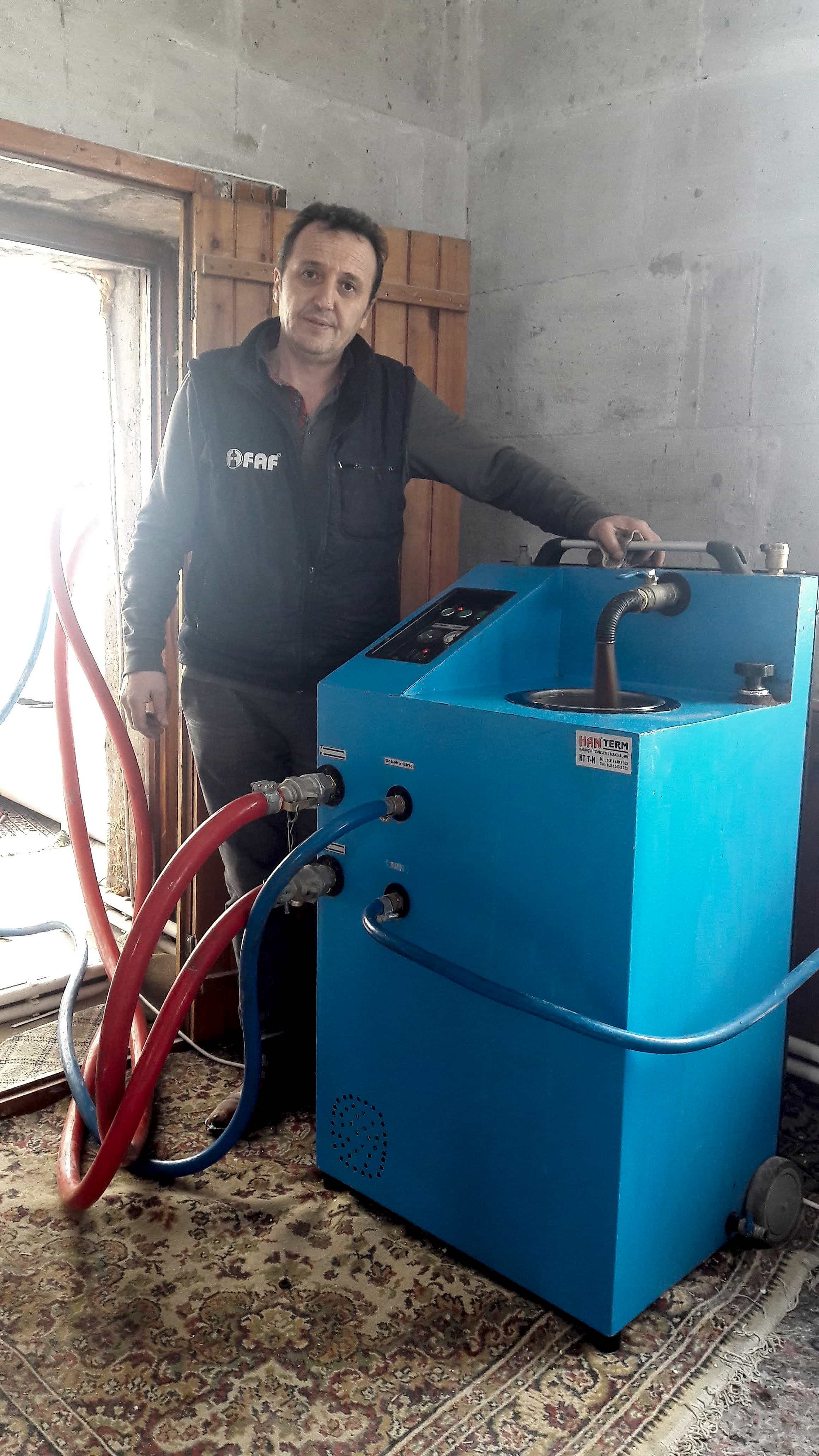 Azerbaycan'da ısıtma sistemlerinde önemli bir adım, uzman makinelerle kimyasal temizleyici kullanılarak bağlantı noktalarının 7 BAR basınçta temizlenmesidir. Bu sayede radyatörler tek tek temizlenir ve sistem hazır hale getirilir.